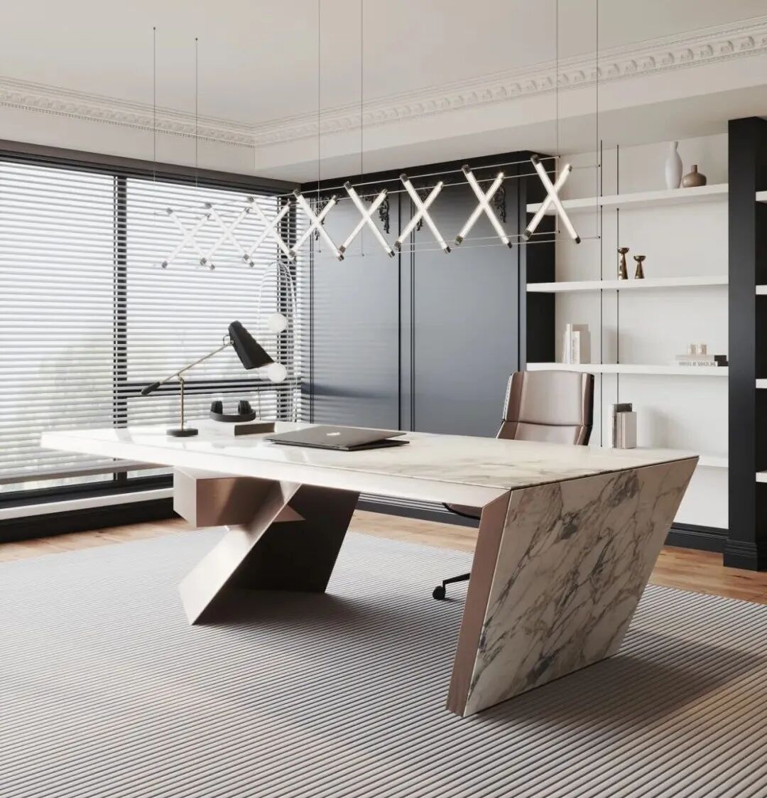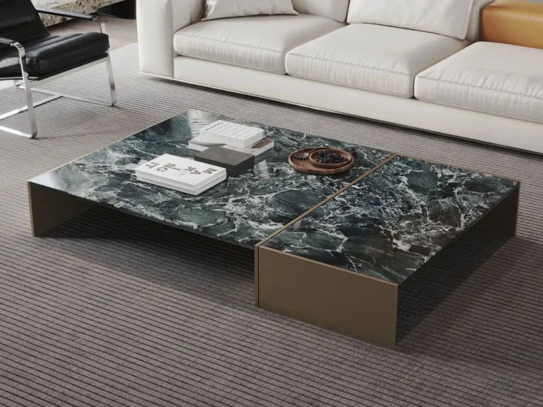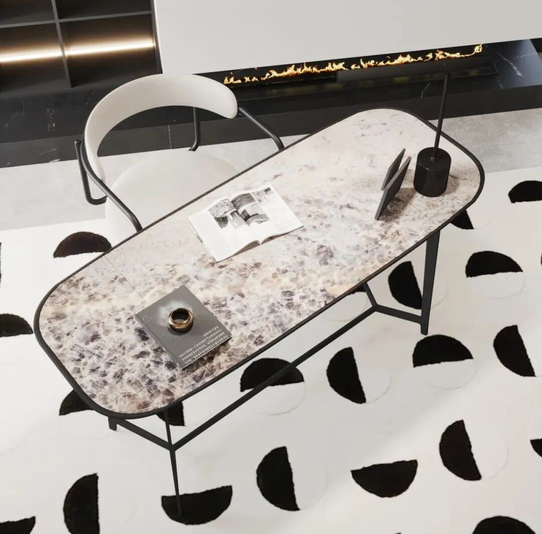 MATERIAL/岩板主材:意大利大花绿VERDE ALPIDESIGNER/设计师:ANTONIO CITTERIOTHE GREEN FOREST COFFEE TABLE IS DESIGNED BY ANTONIO CITTERIO, A FAMOUS ITALIAN FURNITURE DESIGNER. THE LACQUERED METAL BASE IS PAIRED WITH 12MM THICK ITALIAN GREENSTONE PLATE TO CREATE A FRESH SMELL OF GREEN.GREEN FOREST茶几由意大利知名家具设计师ANTONIO CITTERIO 亲自操刀。烤漆金属底座搭配12MM厚的意大利大花绿岩板,营造出绿意盎然的清新气息。MATERIAL/岩板主材:索伦托灰SORRENTO GRIGIODESIGNER/设计师:MATTEO NUNZIATIDESIGNER MATTEO NUNZIATI IS GOOD AT MAKING THE BEST USE OF THE MATERIALS SELECTED IN HIS DESIGN. HE USES SORRENTO GRIGIO TO CONNECT THE LINES ON ALL SIDES OF THE TEA TABLE, WHICH IS SUITABLE FOR BOTH FAR AND NEAR PRODUCTS. Z-SHAPED STAINLESS STEEL BASE IS SIMPLE AND DOES NOT TAKE UP SPACE BUT ALSO TAKES INTO ACCOUNT STABILITY.设计师MATTEO NUNZIATI擅长对设计选材的物尽其用,利用索伦托灰SORRENTO GRIGIO多面连纹效果,将茶几四侧设计成连纹应用,远观近品皆宜。Z字型不锈钢底座简洁不占空间还兼顾稳固性。MATERIAL/岩板主材:深网纹大花白 ARABESCATOTHE BEAUTY OF BENDING GETS THE INTERPRETATION OF INCISIVELY AND VIVIDLY ON THE BEND DESK. THE ROCK PLATE DESK MADE BY TWO PARTS OF PAINT METAL AS A FIGURE-7 BRACKET COMBINED WITH SILK SOFT AND DUMB SURFACE TECHNOLOGY IS BIG AND WHITE, SHOWING THE ELEGANT AESTHETICS OF MODERN FURNITURE.弯曲美在BEND书桌上得到淋漓尽致的诠释。由两部分烤漆金属作为7字形支架结合丝绸柔哑面工艺的深网纹大花白打造的岩板书桌,展现现代家具的典雅美学。MATERIAL/岩板主材:普罗旺斯水晶PROVENCE CRYSTALDESIGNER/设计师:MATTEO NUNZIATITHIS CHIC LITTLE ROCK DESK PAYS HOMAGE TO MINIMALISM AND FUNCTIONALITY. THE I-SHAPED BRACKET HOLDS THE LARGE FLOWER-LIKE PROVENCE CRYSTAL ROCK PLATE, WHICH LOOKS FULL OF CREATIVITY AND CREATES A PLEASANT LEARNING ATMOSPHERE FOR READERS.这款造型别致的小型岩板书桌致敬极简与功能主义。工字型支架托起大碎花效果的普罗旺斯水晶PROVENCE CRYSTAL岩板,看起来创意十足,给阅读者营造愉悦的学习氛围。LAMBDA SIDE CABINET IS DESIGNED AS THE BEST-SELLING TWO-DOOR CABINET. THE BLACK AND GOLD KUROCA OF BRAZIL WITH DUMB SURFACE TECHNOLOGY HAS SMOOTH LINES, AND THE NATURAL TEXTURE OF CONCAVE AND CONVEX STONE MAKES THE SIDE CABINET A GOLDEN SUPPORTING ROLE IN HOME LIFE.
