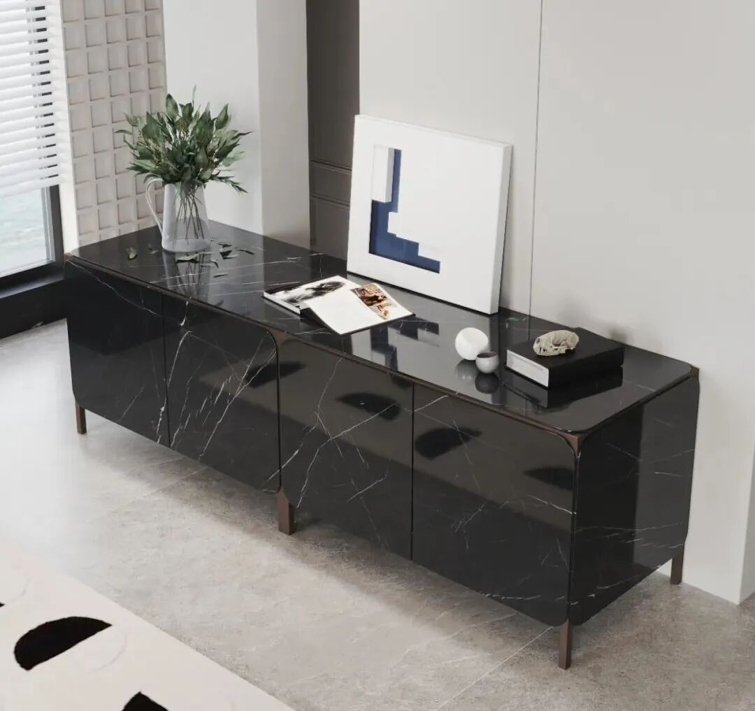 MATERIAL/岩板主材:马基那黑MARQUINAWHITE SILK SIDE CABINET IS THE SIGNATURE WORK OF DESIGNER ALAN TYE, WHICH IS A SYMBOL OF SIMPLICITY AND POETRY. THE LENGTH OF 180CM MAKES THE FOUR-DOOR CABINETS COMPLEMENT EACH OTHER WITH BOTH INTERNAL STORAGE AND EXTERNAL DECORATION.WHITE SILK边柜是设计师ALAN TYE的标志性作品,是简洁与诗意的象征。180CM总长让四门柜兼具内储物和外装饰相得益彰。