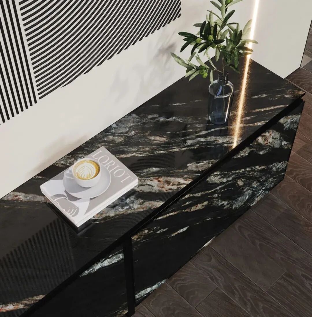 LAMBDA边柜被设计成最畅销的两门边柜,肌理哑面表面工艺的巴西黑金KUROCA黑白金三色线条流畅,媲美石材凹凸有致的天然质感让边柜成为家居生活的黄金配角。